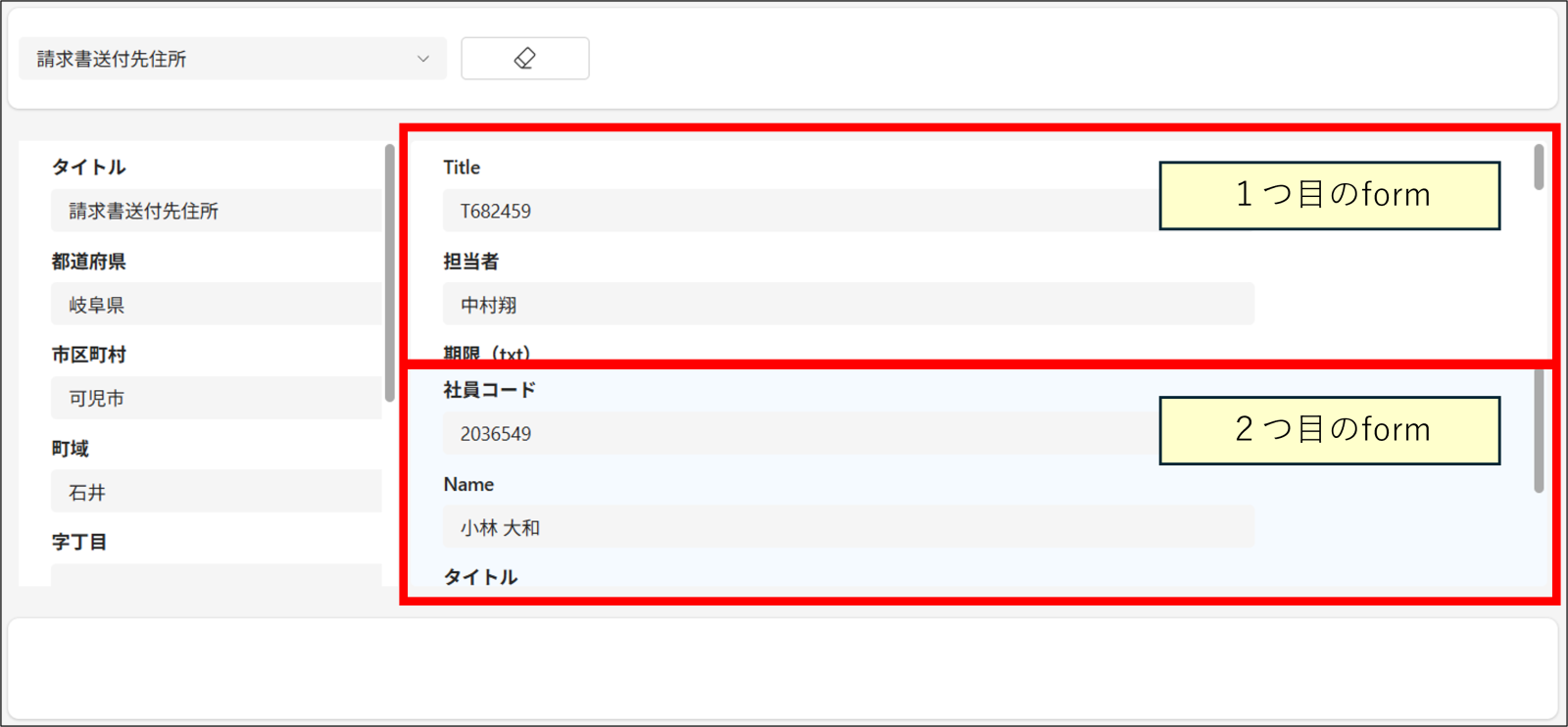初期設定のままだと、左記のように、縦に並べた1つ目のformと2つ目のformが完全に分離してしまうことがあります。