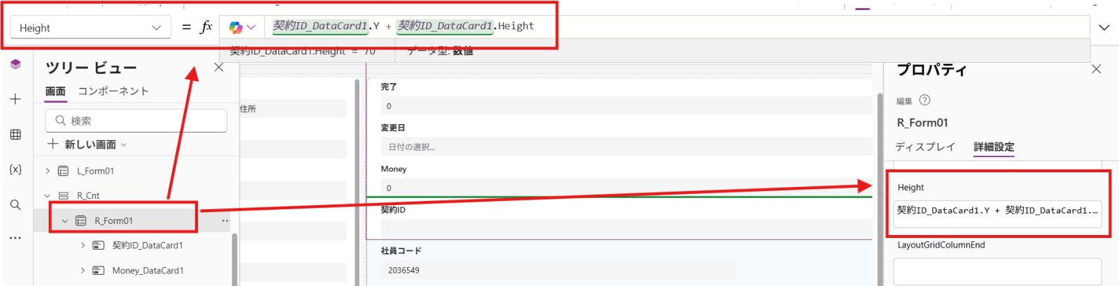 1つ目のformの高さに、データカードのYと高さを合体させたものを設定します。