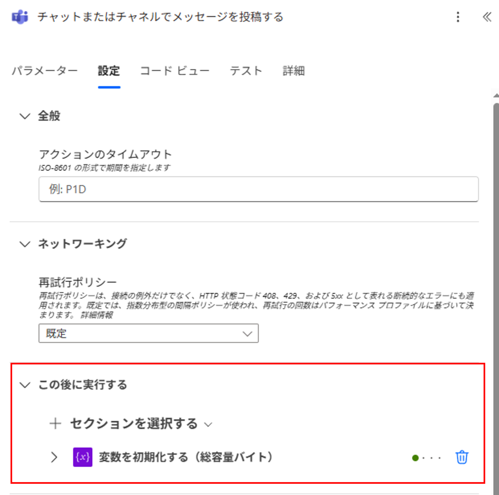 並列を収束させたいアクション(ここでは「チャットまたはチャネルでメッセージを投稿する」)の「設定」タブを開き、「この後に実行する」を確認します