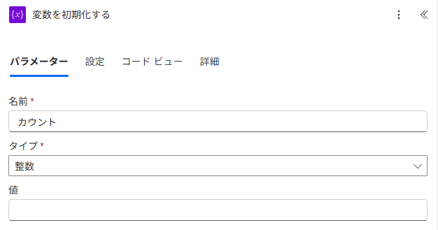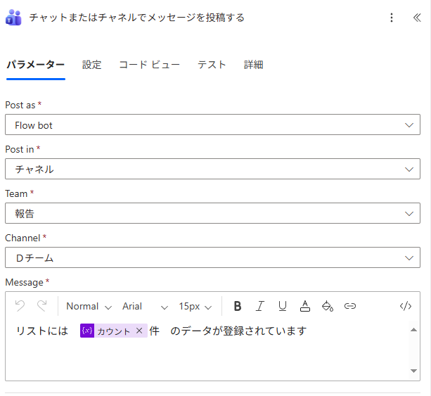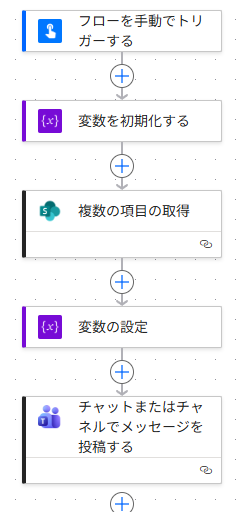 ※「変数の初期化」と「変数の設定」を削除してデータ操作の「作成」を1つ作る、でも良いかと思いますが、フロー譲渡すること考えるとこちらの方が良いんですよね(-_-;)