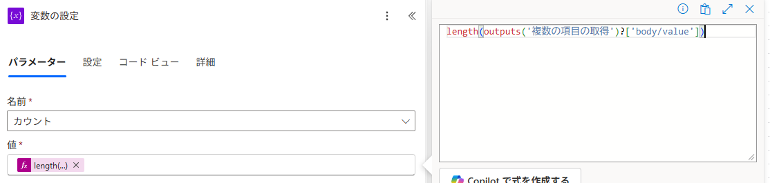 続いて、レコード数をカウントするための式を入れ、最初に初期化していた変数に格納します。