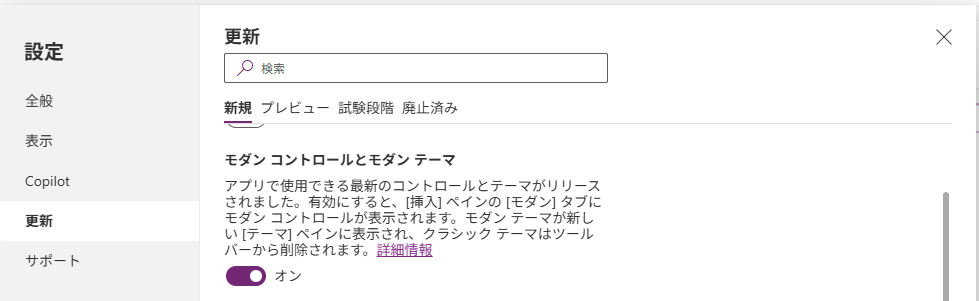 設定 > 更新 > 新規 > モダンコントロールとモダンテーマ