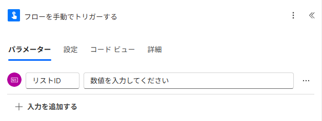 ここではリストIDを手動投入するように作成してます(フローで何をするか決まっていれば、それに合わせたトリガーでOK)